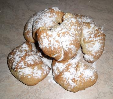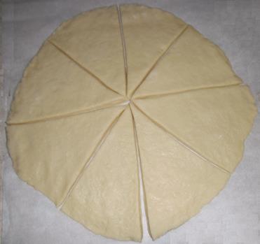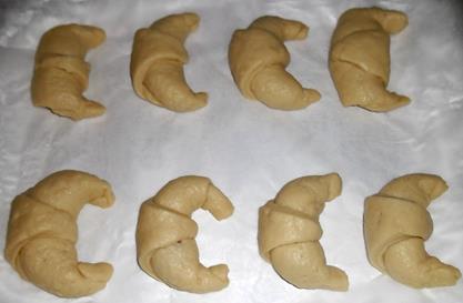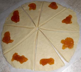 Mettere la confettura e arrotolare lentamente ogni triangolo dal lato grande verso la punta dando la forma del cornetto, facendo attenzione che la confettura non fuoriesca.
